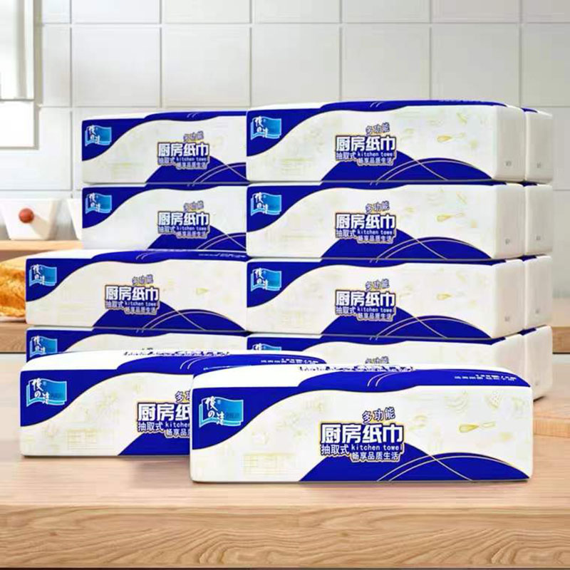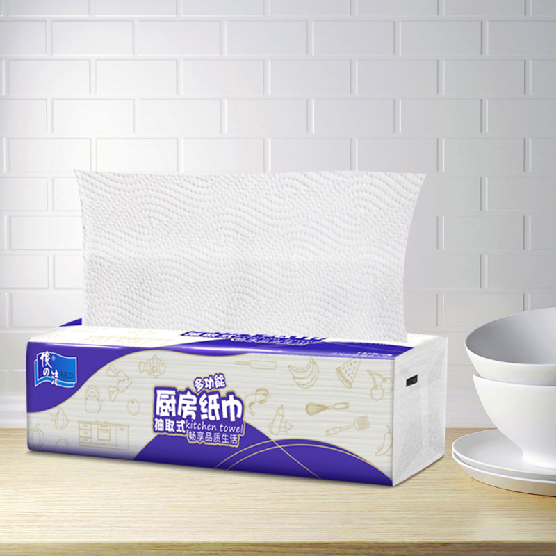 V-Fold Wood Pulp Kitchen Towel is folded by the machine and sealed with plastic film packaging. It‘s packaged the same way as facial tissue. And it absorbs water and oil as well as roll kitchen towel.